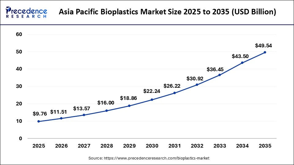 The Asia Pacific bioplastics market size is accounted at USD 9.76 billion in 2025 and is projected to be worth around USD 49.54 billion by 2035, poised to grow at a CAGR of 17.64% from 2026 to 2035.