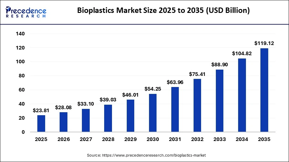 Ottawa, March 02, 2026 (GLOBE NEWSWIRE) -- According to Precedence Research, the global bioplastics market size accounted for USD 23.81 billion in 2025 and is predicted to increase from USD 28.08 billion in 2026 to approximately USD 119.12 billion by 2035, expanding at a CAGR of 17.47% from 2026 to 2035. This market is exploding due to the rise in demand for sustainable packaging and strict regulation standards on single-use plastics.