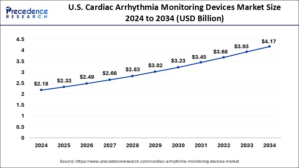 The U.S. cardiac arrhythmia monitoring devices market size is calculated at USD 2.33 billion in 2025 and is projected to exceed USD 4.17 billion by 2034, with a solid CAGR of 6.70% between 2025 and 2034.